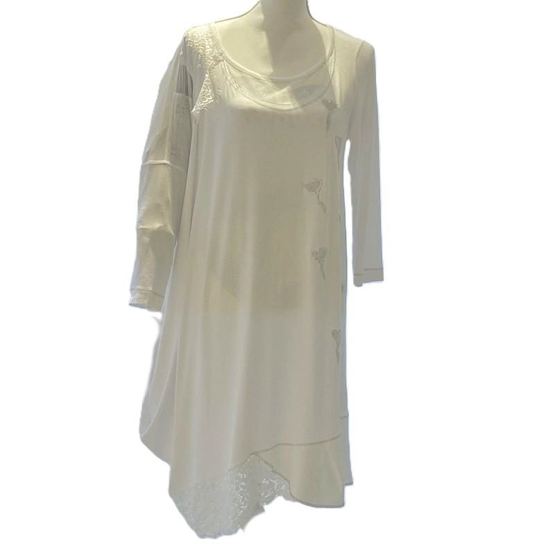 Finissimo abito al ginocchio della linea di Arte Pura. Applicazioni sul davanti con piccoli strass, applicazioni in pizzo sul fondo, sulla manica e sul retro dell'abito. Composizione: 70%VISCOSA+15% POLIESTERE+10%LINO+5% ELASTAM Taglia disponibile M. Ultimo pezzo. Colore Bianco.