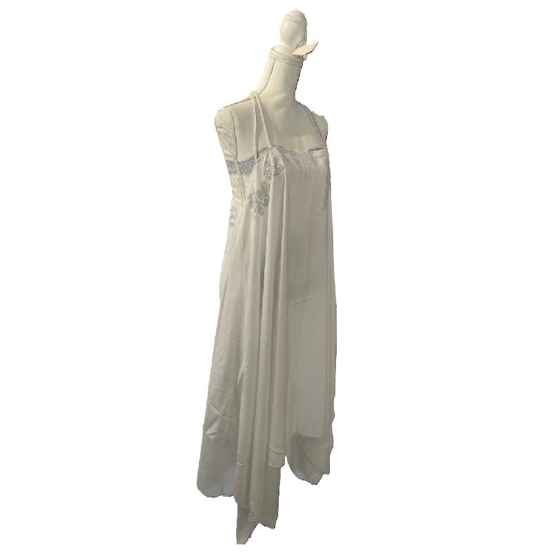 Abito bianco con applicazioni e spalline in filo argentato che si intrecciano sulla schiena.