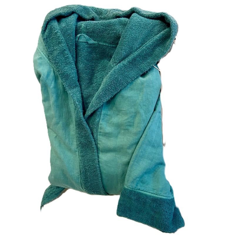 Accappatoio reversibile lungo in spugna con cappuccio e bordi in lino Arte Pura.