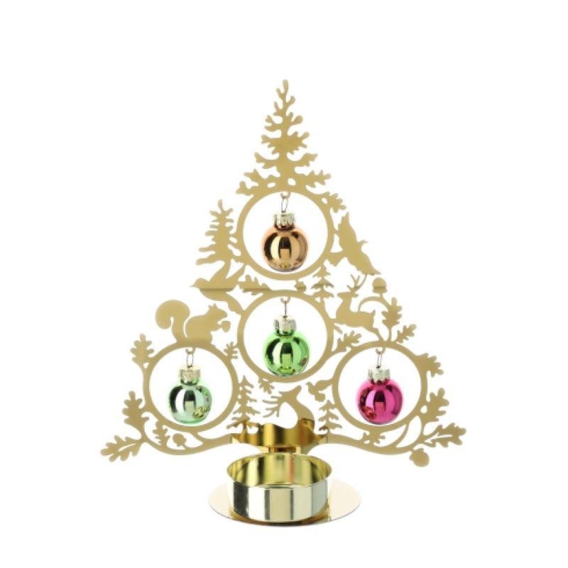 Albero Natalizio portacandela in metallo oro con applicazione di 4 sfere in vetro.