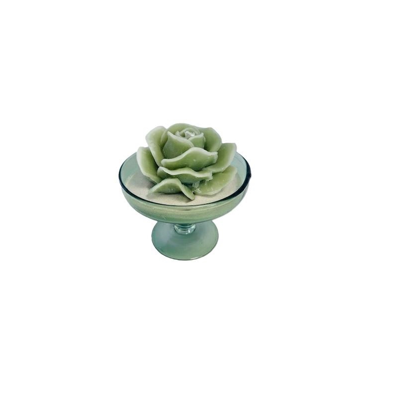 Alzata in vetro colorata verde salvia comprensiva di sabbia decorativa e candela artigianale profumata a forma di rosa, sempre verde.