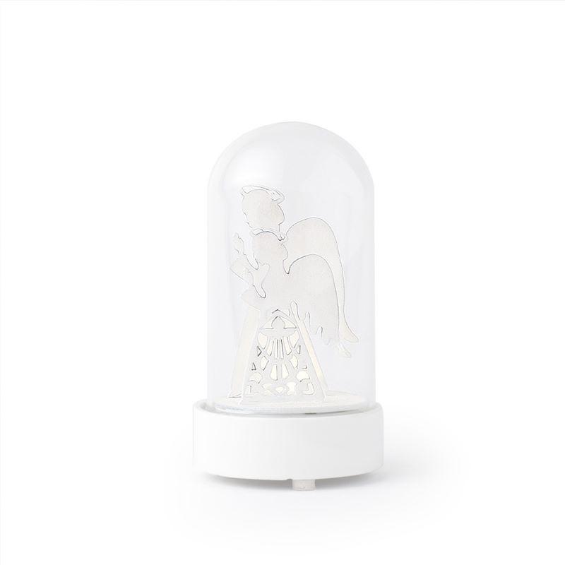 Angeli in legno all'interno di un globo di vetro con luce nella base.