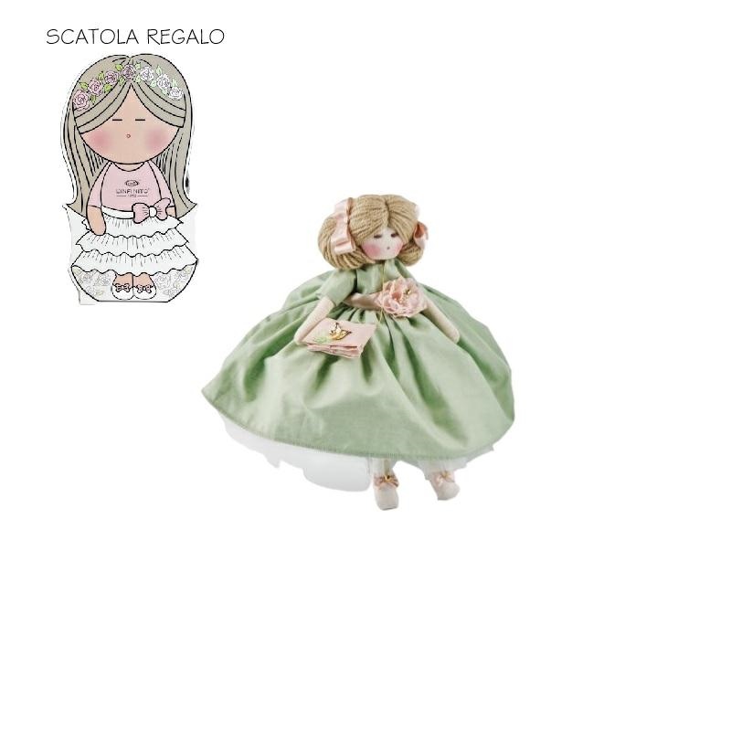 Bambola media di pezza di cotone verde, realizzata artigianalemnte in ogni suo dettaglio.
