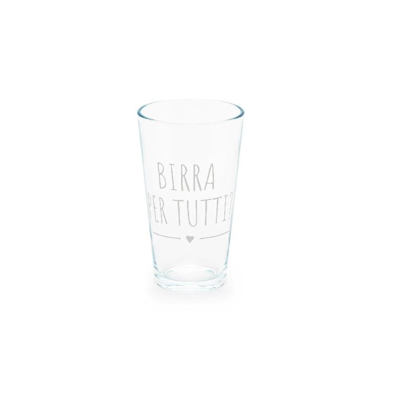 Il set è composto da 6 bicchieri in vetro con decorazione scritta "Birra per tutti?".