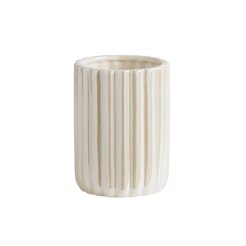 Bicchiere da bagno in ceramica con linee scanalate dalla finitura bianca iridescente. Ideale per valorizzare il vostro bagno.