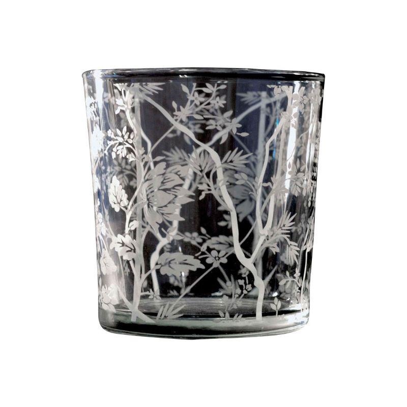 Set composto da 6 bicchieri acqua in vetro nero serigrafato con fiori giapponesi. Linea Ornato Japan di Ceramiche Virginia.