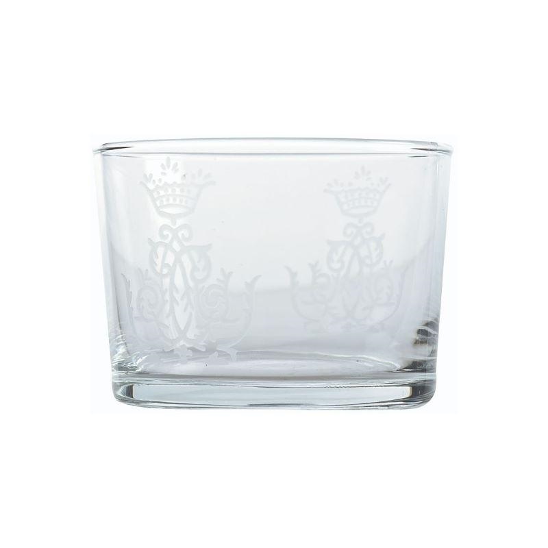 Set composto da 6 bicchieri vino in vetro trasparente serigrafato con stemma Corona di Ceramiche Virginia.