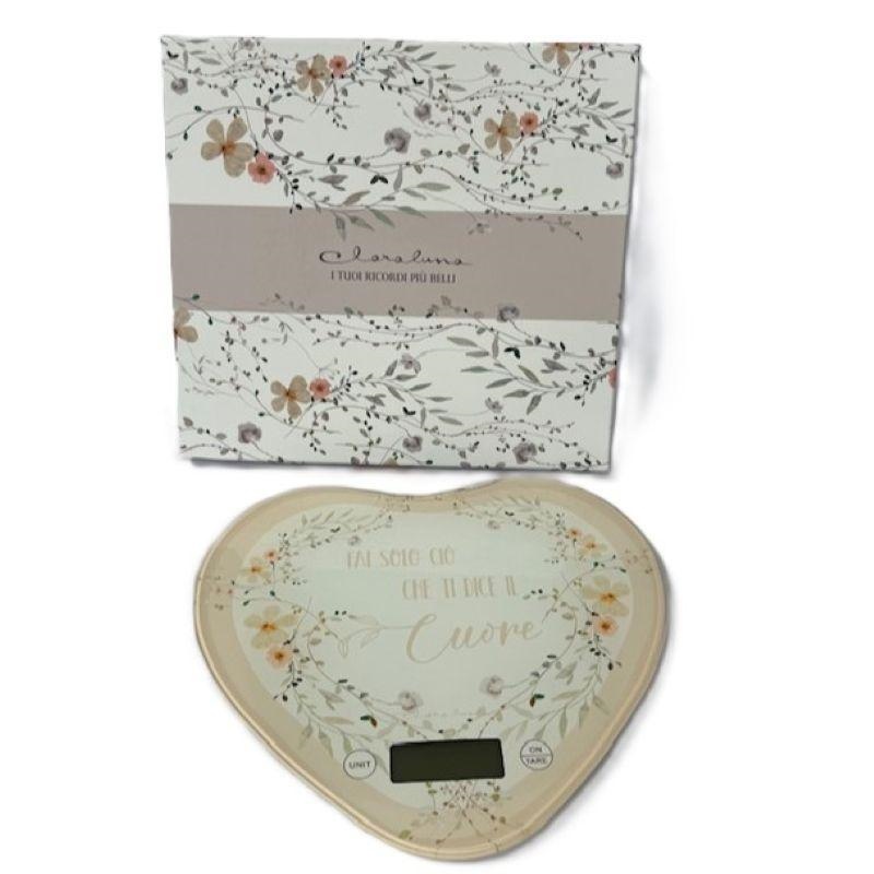 Bilancia in vetro da cucina a forma di cuore con decorazione floreale rosa. Le pile non sono incluse. Dimensioni circa 20x24 cm. Linea Bomboniere Claraluna.Comprensiva di scatola. Per quantità superiori ad 1 pezzo contattare il punto vendita via mail all'indirizzo laculladelleidee@gmail.com o telefonicamente al n.+39 345 9452117