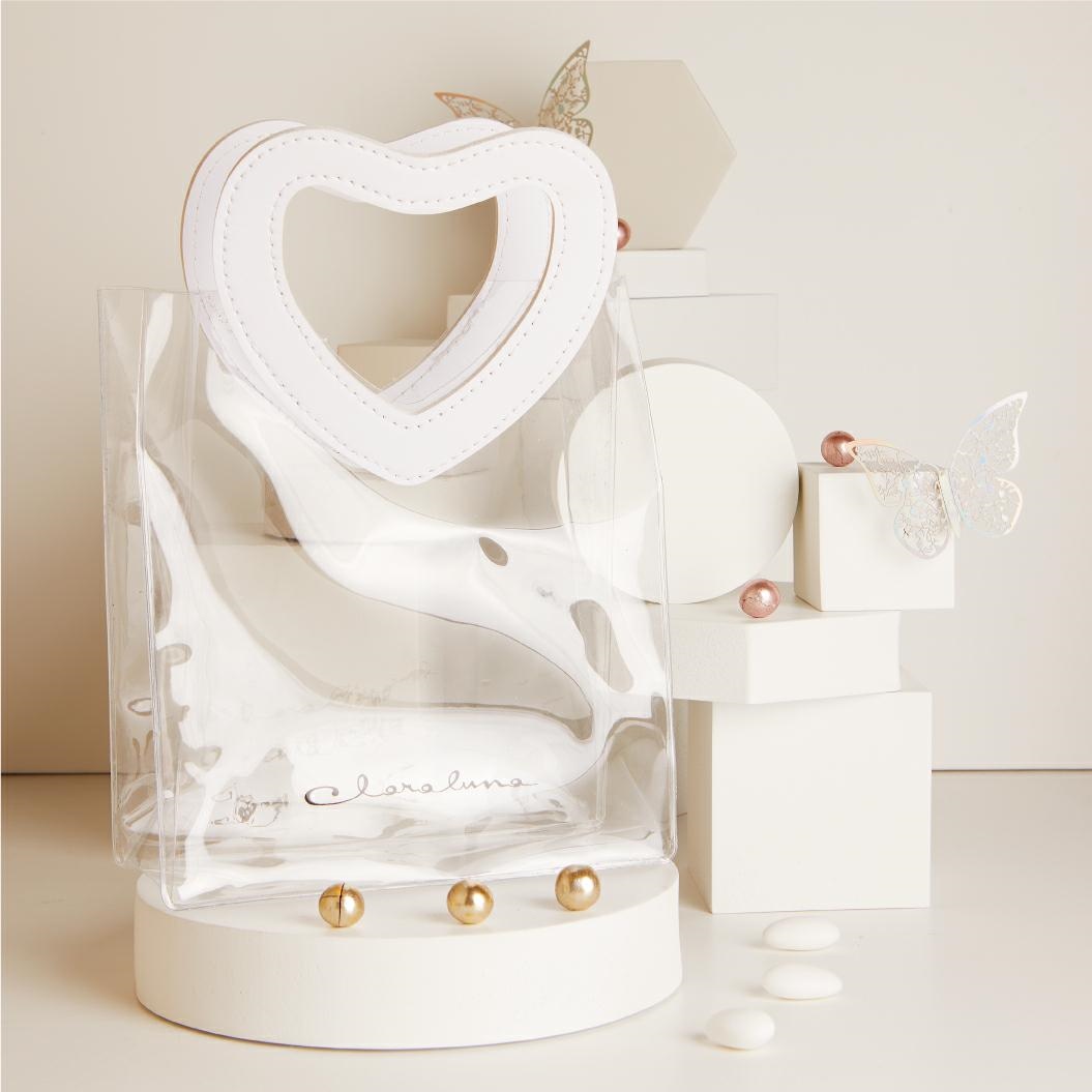 Borsetta trasparente in acrilico con manico similpelle bianco. Ideale per confezionare bomboniere. Dimensioni circa 18x7x20 cm. Linea Bomboniere Claraluna. Per quantità superiori ad 1 pezzo contattare il punto vendita via mail all'indirizzo laculladelleidee@gmail.com o telefonicamente al n.+39 345 9452117