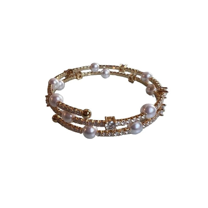 Bracciale manetta senza chiusura. Il bracciale alterna a circa 6 strass, uno strass più grande e una perlina bianca, in maniera alternata, termina con sfera gold. Variante unica come in foto. Il bracciale avvolge il polso di circa 2/3 giri in base alla dimensione del polso.