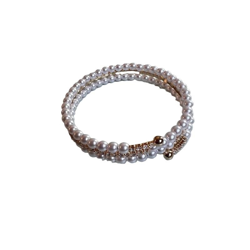 Bracciale manetta senza chiusura. Il bracciale ha una giro di strass applicati in messo a due giri di perline bianche, in maniera alternata. Variante unica come in foto. Il bracciale avvolge il polso di circa 2/3 giri in base alla dimensione del polso.