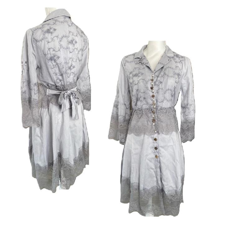 Caftano in cotone 100% con pizzo, abbottonato sul davanti con perle e bottoni preziosi. Nastro sul retro per regolare la vestibilità.