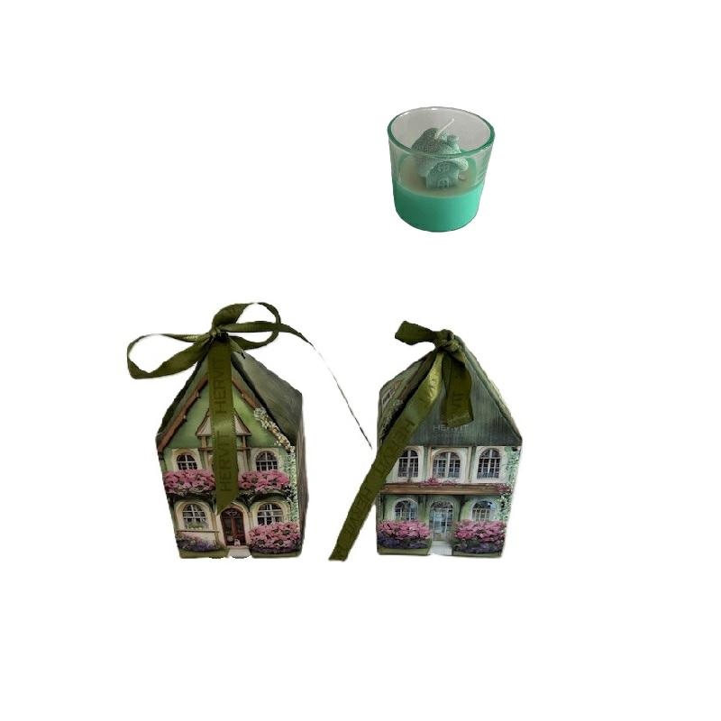 Candela casetta verde , confezionato in cassetta Cottage di carta.