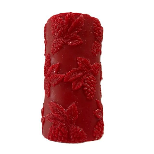 Candela cilindro rossa innevata con decorazione vischio