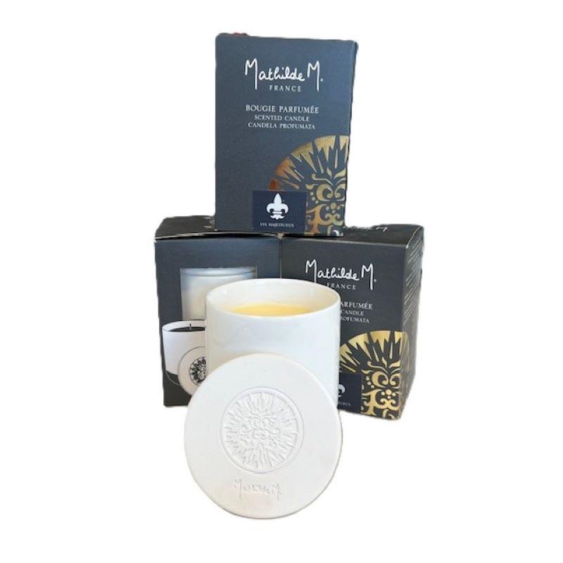 Candela profumata della linea Iconic di Mathilde M. Contenitore in ceramica bianca con base dorata, coperchio odi gesso. Profumazione Lys Majestueux, fragranza floreale e speziata dove il giglio siveste di gelsomino fresco e si adorna di cardamomo. Dimensioni 200 gr-circa 45 ore