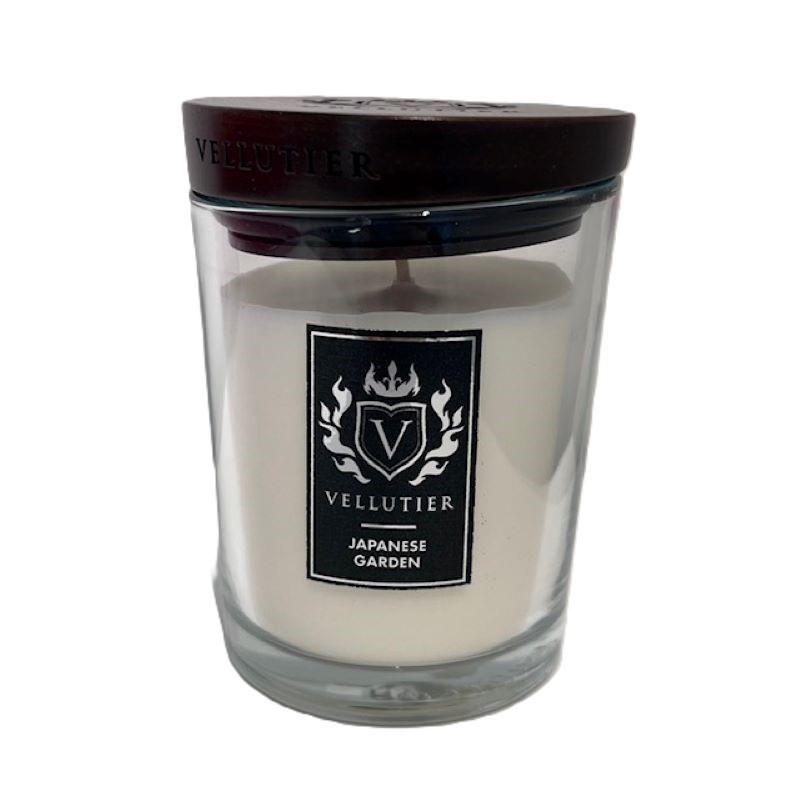 Candela Vellutier di cera vegetale infuse nelle fragranze concentrate in un lussuoso barattolo di vetro con coperchio ermetico di legno. Dimensioni 255 gr. Profumazione Japanese Garden - area olfattiva: floreale; fragranza: fresia, gelsomino, patchouli.