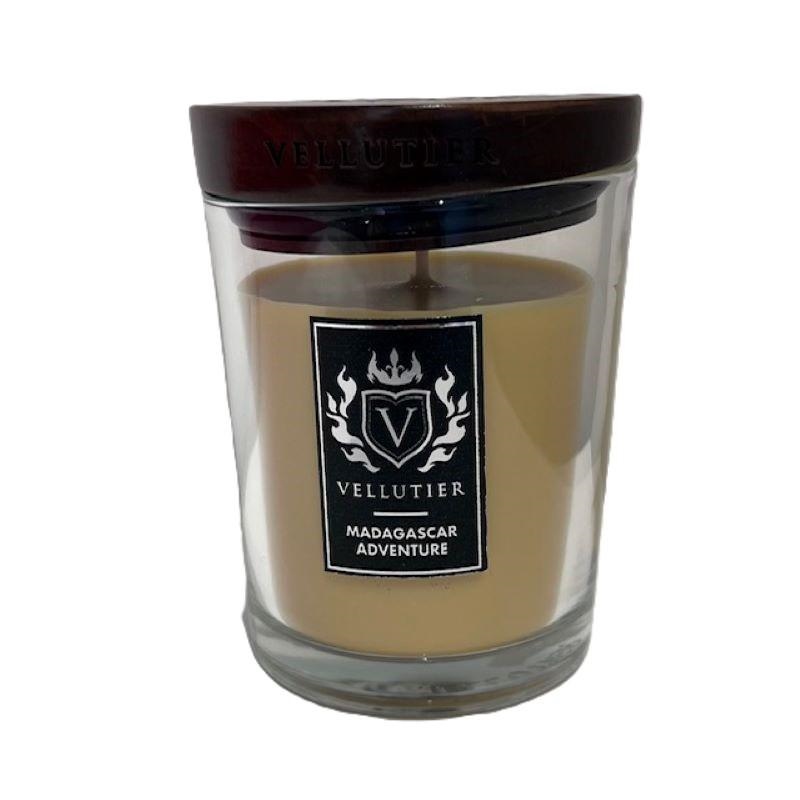 Candela Vellutier di cera vegetale infuse nelle fragranze concentrate in un lussuoso barattolo di vetro con coperchio ermetico di legno. Dimensioni 255 gr. Profumazione Madagascar Adventure - area olfattiva: sensuale/orientale; fragranza: ambra, vaniglia, legno di sandalo.