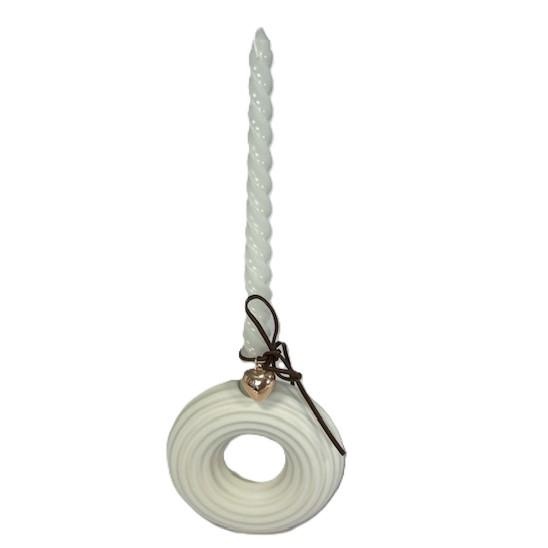 Candelabro tondo motivo in rilievo con cuoricino e candela. Dimensioni d 10 cm. Linea Bomboniere Claraluna.Comprensiva di scatola. Per quantità superiori ad 1 pezzo contattare il punto vendita via mail all'indirizzo laculladelleidee@gmail.com o telefonicamente al n.+39 345 9452117