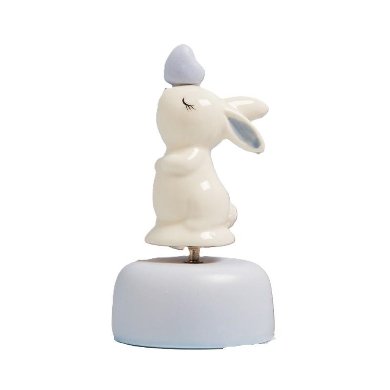 Carillon coniglietto azzurro in porcellana con cuoricino. Dimensioni 5.5x4.3x15 cm. Linea Bomboniere Claraluna. Per quantità superiori ad 1 pezzo contattare il punto vendita via mail all'indirizzolaculladelleidee@gmail.com o telefonicamente al n.+39 345 9452117