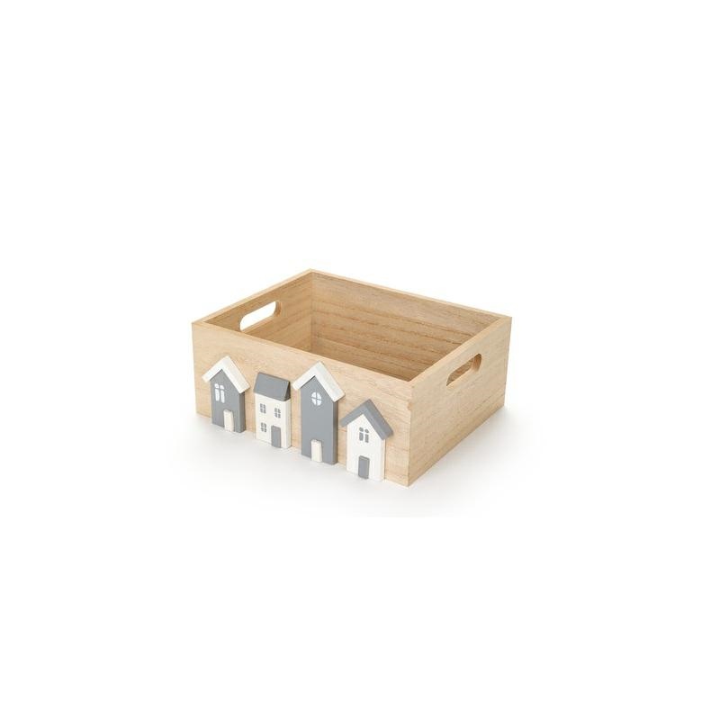 Casssetta/Vassoio in legno con manici e decorazione casette.