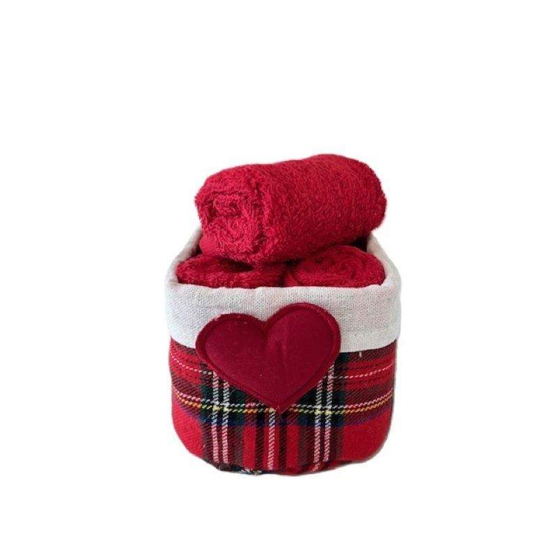Cestino in stoffa imbottina con 4 lavette in cotone rosse.