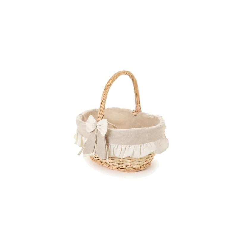 Cestino in vimini con manico, riverstito in stoffa di cotone neutro.