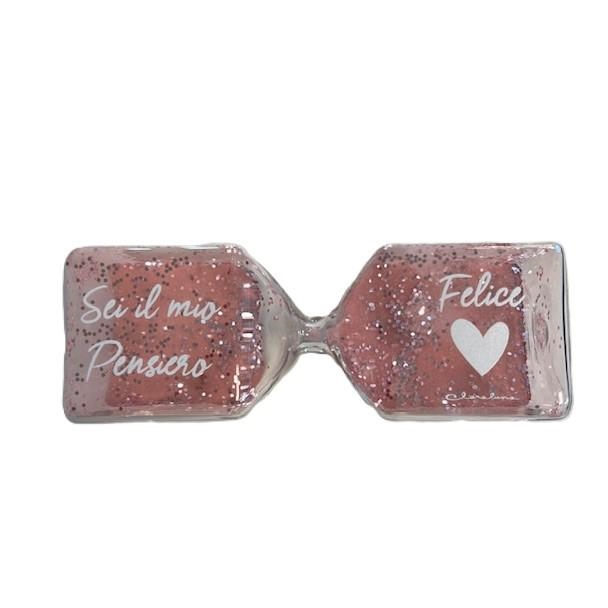 Clessidra grande in vetro con sabbia rosa e brillantini, con frase: "Sei il mio pensiero felice". Dimensioni circa 14x4.5x4.5cm. Linea Bomboniere Claraluna.Comprensiva di scatola. Disponibile anche nella versione con cuore applicato cod. 25212C a € 14.59 Per quantità superiori ad 1 pezzo contattare il punto vendita via mail all'indirizzo laculladelleidee@gmail.com o telefonicamente al n.+39 345 9452117