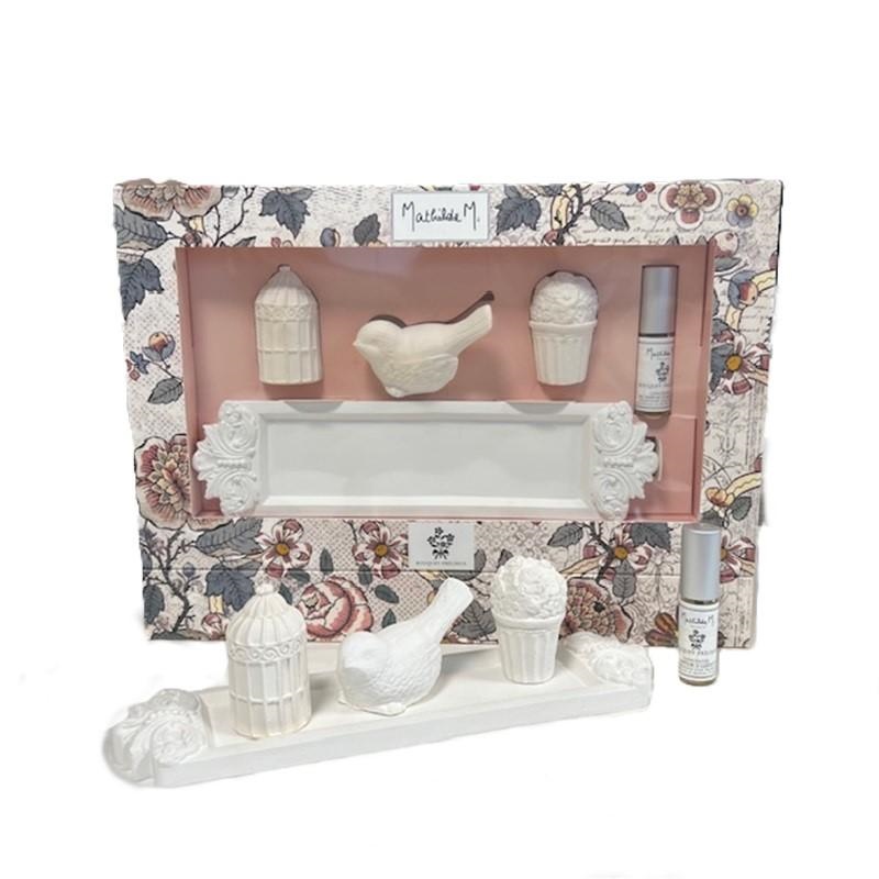 Il set comprende un vassoietto di gesso e 3 miniature sempre in gesso profumate con ricarica spray, profumazione Bouquet Precieux.