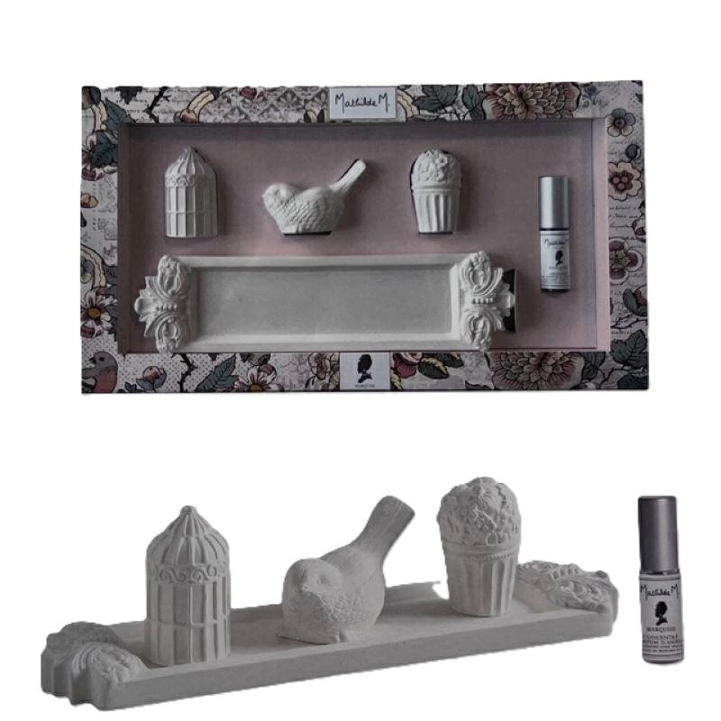 Il set comprende un vassoietto di gesso e 3 miniature sempre in gesso profumate con ricarica spray, profumazione Marquise.