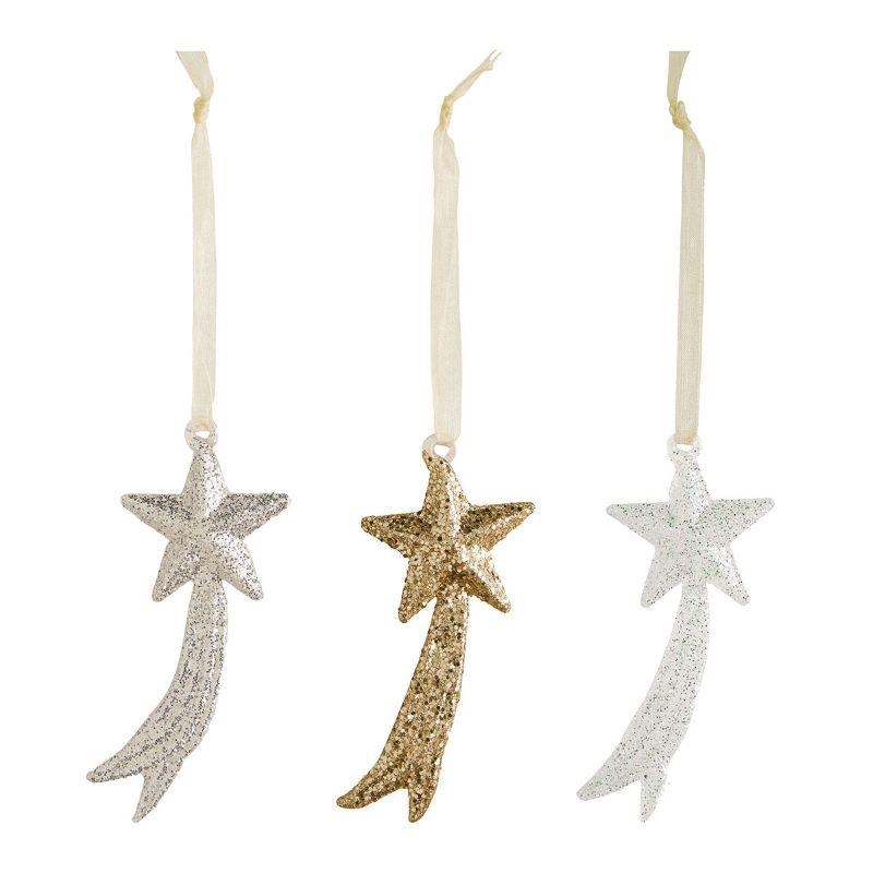 Confezione contenente 3 decorazioni in vetro a forma di stelle filanti con cordino per appenderle.