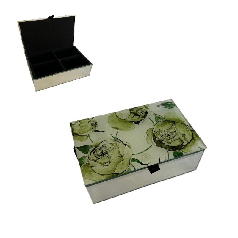 Cofanetto portagioie in legno rivestito vetro e specchio, all'interno foderato in vellutino. Linea Botanic verde.