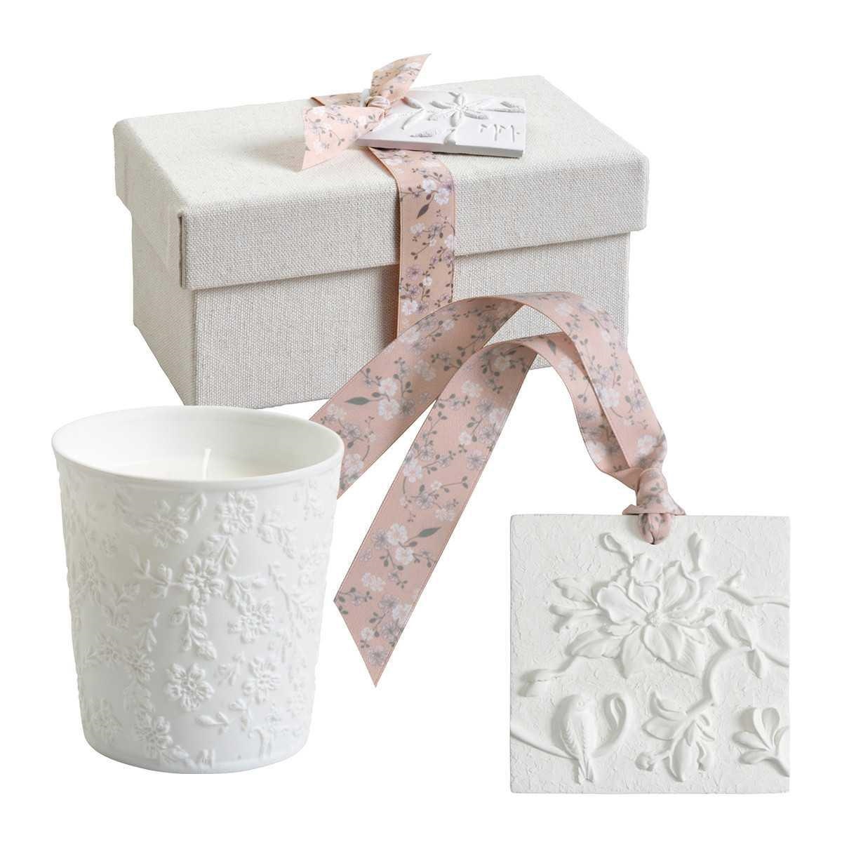 Confezione regalo con candela all'interno di un vasetto decorato in porcellana biscuit e un gessetto decorativo artigianale profumato.