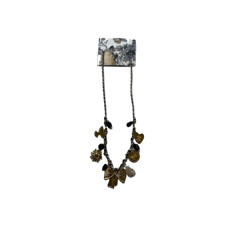 Collana della linea Boho con perline nere e charms con fiocco dorato.