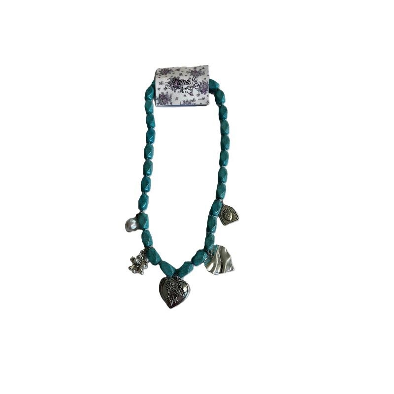 Collana girocollo in pietra turchese con pendagli, il cuore central si apre e contiene uno specchietto.