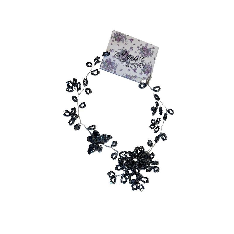 Collana vittoriana semirigida con perline grigie che formano dei fiorellini.