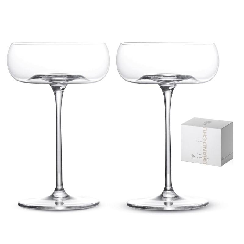 Coppia di coppe Champagne in vetro di alta qualità con gambo stirato, della linea "Grand Cru" regalano eleganza e raffinatezza alla tavola. Ideale anche come coppa per il gelato.