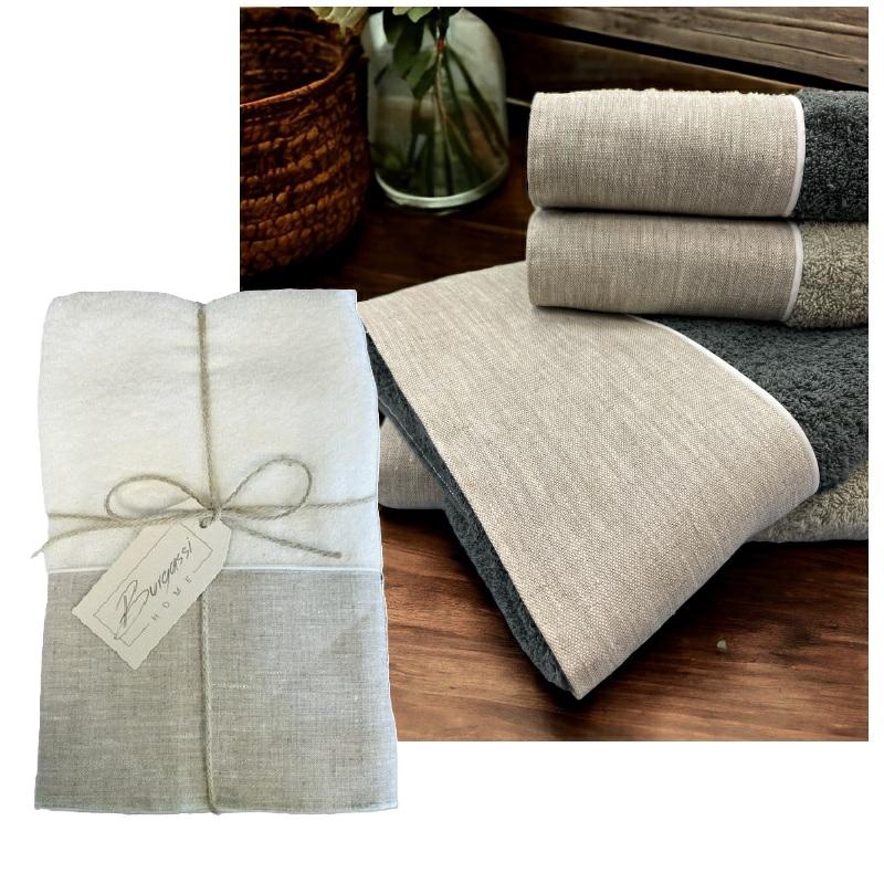 Coppia di asciugamani viso e ospite 100% cotone/spugna 420gr con bordo in lino tinto in capo.