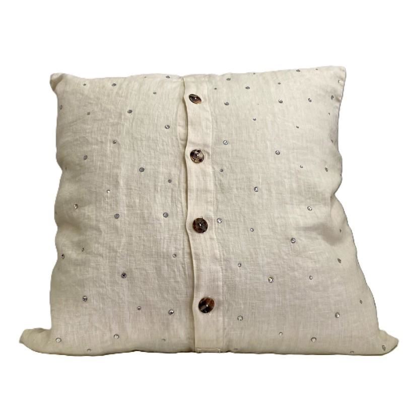 Coppia di federe in lino pesante tempestata di cristalli; chiusura con pregiati bottoni Agoya. Colore Burro old, disponibile anche convivio. Dimensioni 60x60cm. Prodotto con materiali naturali in italia. Dai un tocco prezioso al tuo arredamento, ideale per arredare il letto ma anche il divano.