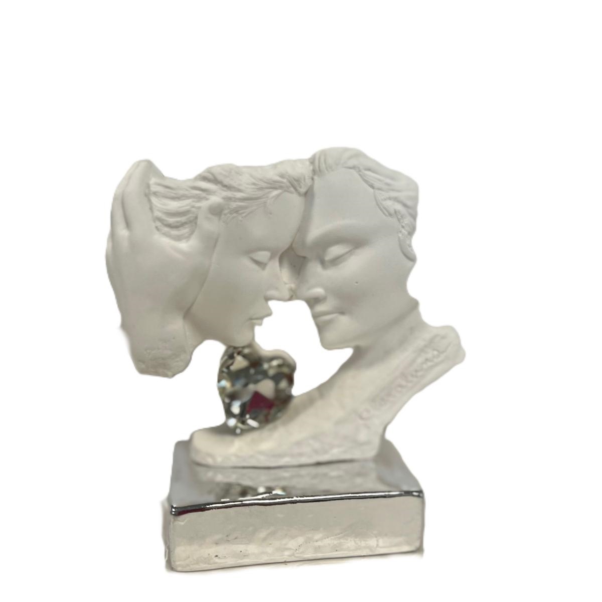 Coppia innamorati di gesso con cuore e base in color silver. Dimensioni circa 11x11x5cm. Linea Bomboniere Claraluna.Comprensiva di scatola. Per quantità superiori ad 1 pezzo contattare il punto vendita via mail all'indirizzo laculladelleidee@gmail.com o telefonicamente al n.+39 345 9452117