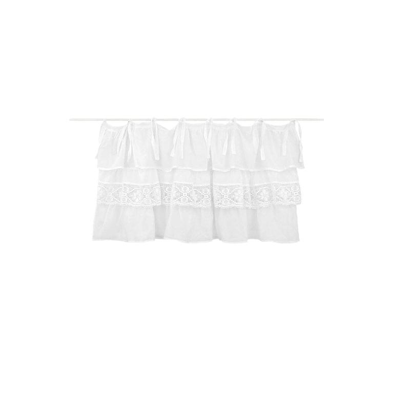 Coppia di mantovane in cotone con balze in tessuno e una striscia in crochet. Comprensive di laccetti per legarle al bastone.