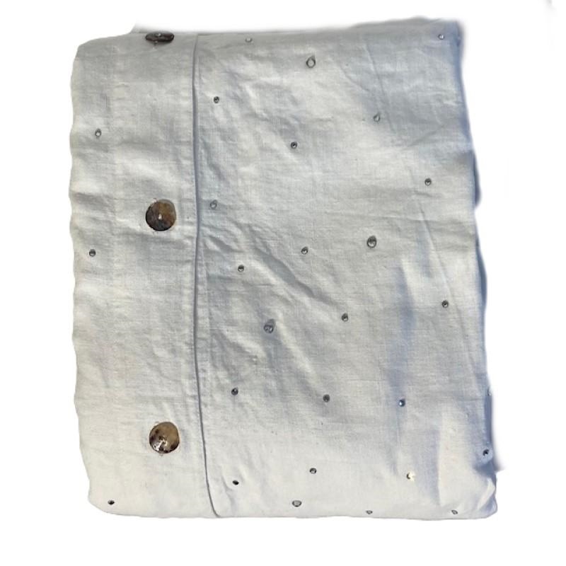 Copripiumone in lino decorato con cristalli. Apertura e chiusura sacco: con bottoni Agoya in madreperla. Misure 250×200+50 (patella). Colore retrò. Copripiumino prodotto in Italia realizzato in100% lino di alta qualità e reso morbido al tatto grazie a trattamenti speciali che esaltano l’aspetto naturale. Tessuto ideale per il letto perché ipoallergenico e antibatterico, in aggiunta all’uso di tinture naturali e anallergiche che donano lucentezza e brio alla fibra naturale.