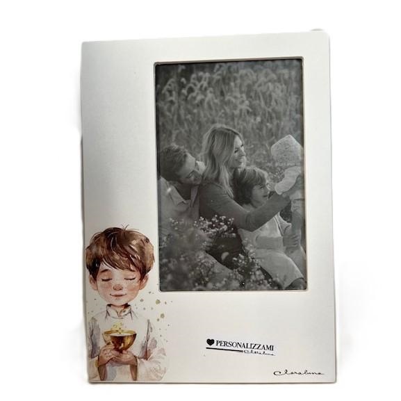 Cornice in legno con decorazione disegno per bambino, Prima Comunione. Personalizzabile. Dimensioni cornice 15x21 cm, dimensioni foto 9x14 cm. Linea Bomboniere Claraluna.Comprensiva di scatola. Per quantità superiori ad 1 pezzo e personalizzazione contattare il punto vendita via mail all'indirizzo laculladelleidee@gmail.com o telefonicamente al n.+39 345 9452117