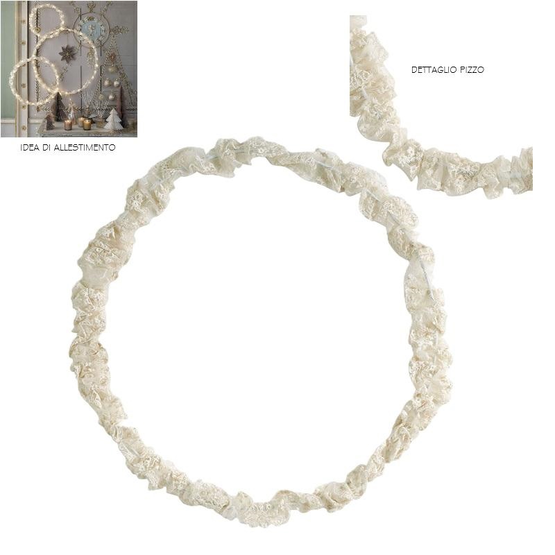 Corona luminosa Dentelle. Rivestita con il suo elegante tessuto, porterà poesia e morbidezza al vostro arredamento e troverà facilmente posto in un ingresso, in soggiorno o anche nella cameretta dei bambini. Composizione: ferro, poliestere, LED Dimensioni: ø 50 cm Alimentazione a rete.