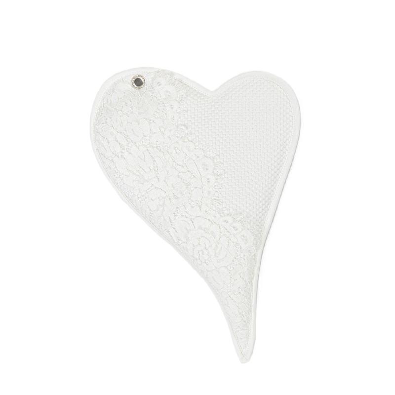 Cuore bianco naturale con vela color argento con strass appliccati per appenderlo. Ricamo applicato in pizzo bianco su tessuto effetto piquet. Parte posteriore in tessuto effetto simil pelle con logo con mezze perle. Colore bianco. Cuore decoro prodotto in Italia con tessuto morbido al tatto. Decora i tuoi ambienti donando un tocco di originalità al tuo arredamento.