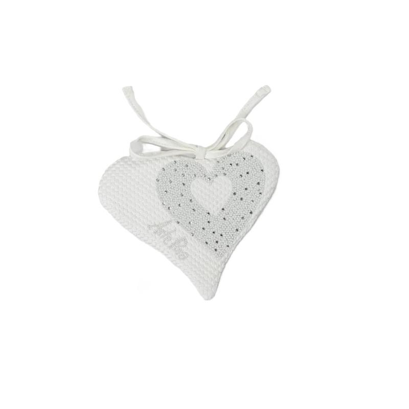 Cuore piccolo bianco naturale con laccetto integrato nel tessuto per appenderlo, decorato con strass e cristalli bianchi a formare un cuore su tessuto effetto piquet. Parte posteriore con tessuto effetto pelle. Logo frontale con mezze perle. Cuore decoro prodotto in Italia con tessuto morbido al tatto. Decora i tuoi ambienti donando un tocco di originalità al tuo arredamento e alle tue tende.