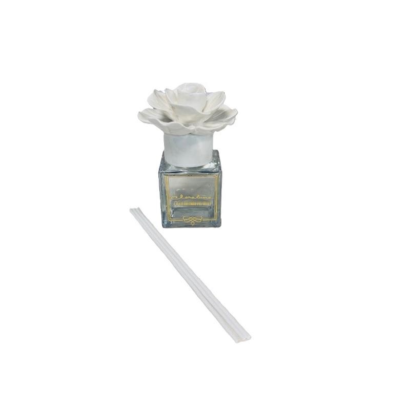 Diffusore di profumo per ambiente composto da una bottiglia in vetro da 100ml di profumo floreale con fiore in ceramica bianco, midollini inclusi. Dimensioni 5.7x5.7x12cm. Linea Bomboniere Claraluna.Comprensiva di scatola. Per quantità superiori ad 1 pezzo contattare il punto vendita via mail all'indirizzo laculladelleidee@gmail.com o telefonicamente al n.+39 345 9452117