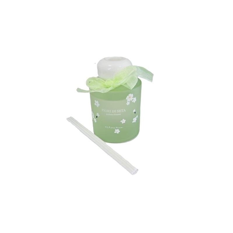 Diffusore di profumo da 120 ml verde con decoro fiori.Kit midollini e profumo inclusi. Dimensioni 6.5x10.3 cm. Linea Bomboniere Claraluna.Comprensiva di scatola. Per quantità superiori ad 1 pezzo contattare il punto vendita via mail all'indirizzo laculladelleidee@gmail.com o telefonicamente al n.+39 345 9452117
