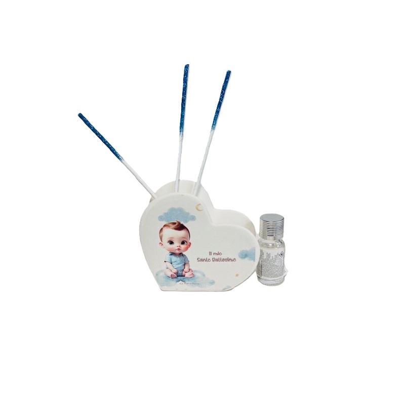 Diffusore di profumo per ambiente a forma di cuore in gesso con decorazione per battesimo bimbo con possibilità di personalizzazione, kit midollini e profumo inclusi. Dimensioni 10x4x9cm. Linea Bomboniere Claraluna.Comprensiva di scatola. Per quantità superiori ad 1 pezzo e per la personalizzazione contattare il punto vendita via mail all'indirizzo laculladelleidee@gmail.com o telefonicamente al n.+39 345 9452117