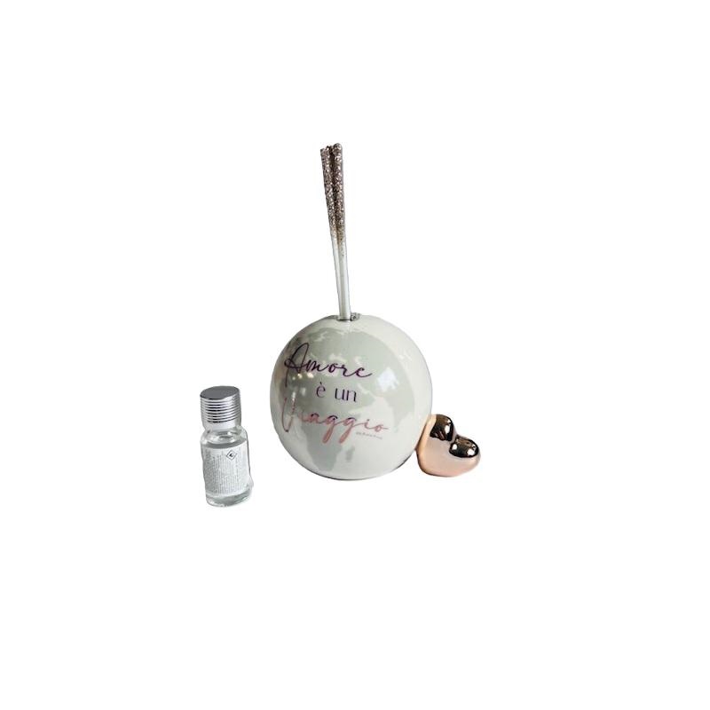 Diffusore modno grande con con applicazione cuore oro rosa e scritta "L'amore è un viaggio". Kit midollini e profumo inclusi. Dimensioni 10x7.5x7.5 cm. Linea Bomboniere Claraluna.Comprensiva di scatola. Per quantità superiori ad 1 pezzo contattare il punto vendita via mail all'indirizzo laculladelleidee@gmail.com o telefonicamente al n.+39 345 9452117