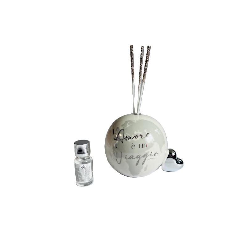 Diffusore modno grande con con applicazione cuore silver e scritta "L'amore è un viaggio". Kit midollini e profumo inclusi. Dimensioni 10x7.5x7.5 cm. Linea Bomboniere Claraluna.Comprensiva di scatola. Per quantità superiori ad 1 pezzo contattare il punto vendita via mail all'indirizzo laculladelleidee@gmail.com o telefonicamente al n.+39 345 9452117